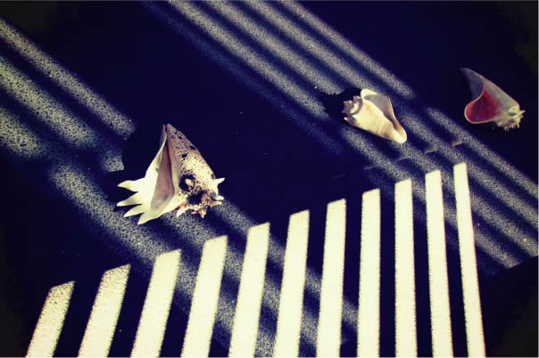 コメント:「鞆の浦で長い時間を過ごしてきた貝たちに格子窓の波間から光が差し込みいつかの時代や現在が交錯しているように見えました。時間帯で光が変わる演出の貝のフォルムの展示関わる全ての方々と貴重な今という時間を重ねられる幸せに感謝します。」